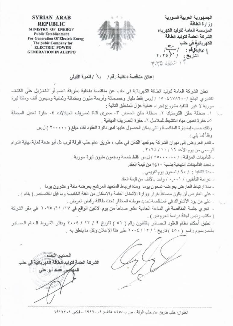 مناقصة داخلية رقم /10/ للشركة العامة لتوليد الكهرباء في حلب لعام 2025.